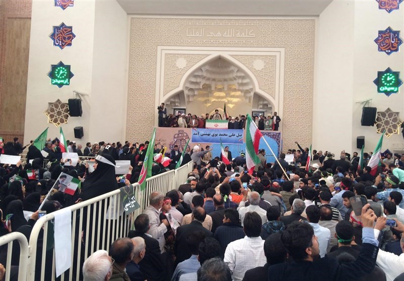 ازدحام جمعیت در پایین مصلی سبب شد که حتی برخی از افراد به قسمت فوقانی مصلی بروند و یا در بیرون از مصلی تجمع کنند و در نهایت با تاخیری 30 دقیقهای حجتالاسلام رئیسی وارد جمعیت شد و این حضور جمعیت را آنچنان به شور آورد که دیگر صدای رئیس ستاد انتخابات آقای رئیسی برای خیرمقدمگویی در جمعیت به گوش نمیرسید.