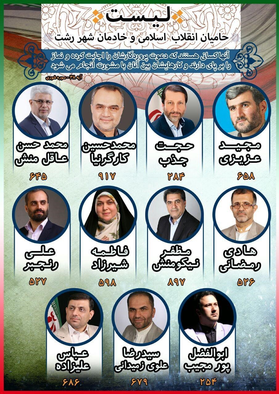 وی "حامیان انقلاب اسلامی و خادمان شهر رشت" را عنوان این لیست و ائتلاف معرفی کرد و افزود: محمدحسن عاقل منش، محمدحسین کارگرنیا، حجت جذب، مجید عزیزی، علی رنجبر، فاطمه شیرزاد، مظفر نیکومنش، هادی رمضانی، عباس علیزاده، سیدرضا علوی زمیدانی و ابوالفضل پورمجیب در این لیست قرار دارند.