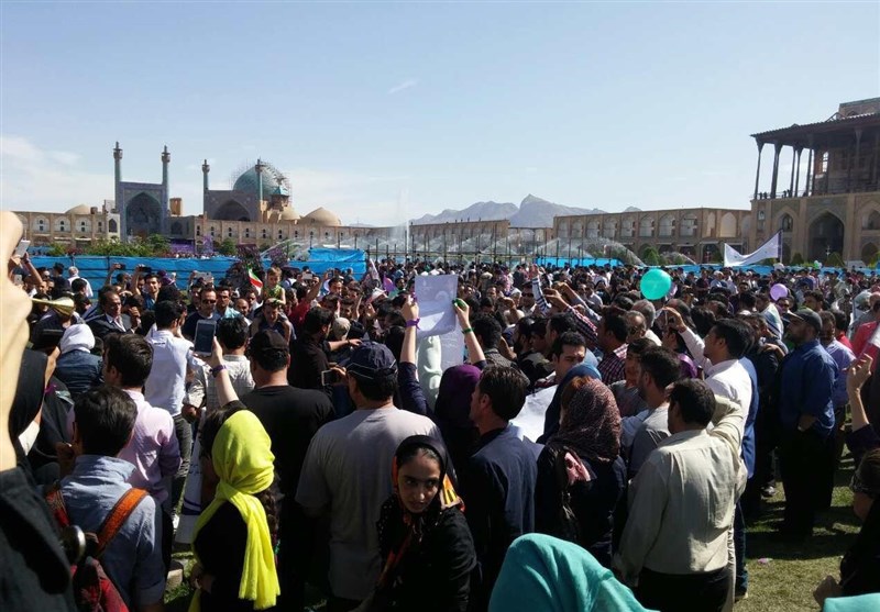 میان جمعیت زمزمه‌هایی مبنی بر دلخوری بابت حضور کمرنگ هواداران روحانی دیده شنیده می‌شود. 30 دقیقه تا شروع سخنرانی روحانی در میدان امام(ره) زمان باقی است.