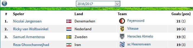 در ردهبندی برترین بازیکنان و پاسورهای اردویژه هلند نیکولای یورخنسن از فاینورد با کسب امتیاز 32 از مجموع 21 گلزده و 11 پاس گل در جایگاه نخست قرار گرفت. در این بخش رضا قوچاننژاد (هیرنوین) با مجموع 19 گلزده، 3 پاس گل و کسب امتیاز 22 رتبه پنجم را به دست آورد. علیرضا جهانبخش رتبه سیزدهم ردهبندی برترین بازیکنان و پاسورهای اردویژه هلند رده سیزدهمی را با کسب امتیاز 18 به خود اختصاص داد.