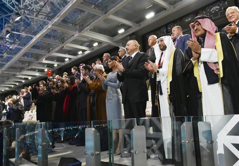 در ویژه برنامههای مراسم افتتاحیه رسمی این بازیها نیز نمایشهایی ارائه شد که تاریخ ایران مصادره به مطلوب شده است و در انکار هویت شیعی مردم جمهوری آذربایجان نیز اذان عالم قاسم اف، خواننده مشهور جمهوری آذربایجان از مناره «مسجد حیدر» باکو پخش شد که در آن شهادت به امامت امام علی (ع) حذف شده است تا این اقدام باکو رضایت خاطر وهابیهای سعودی را جلب کند.