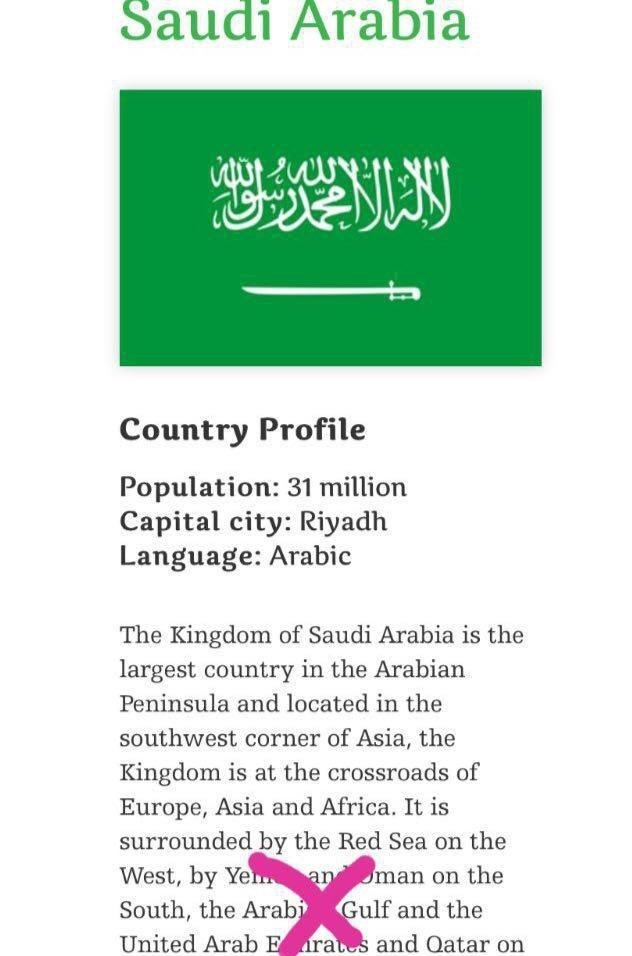 به گزارش گروه دفاتر خارجی خبرگزاری تسنیم، در این سایت در معرفی عربستان سعودی، در بیان موقعیت جغرافیایی این کشور در حاشیه جنوبی خلیج فارس، به جای نام واقعی این حوزه آبی – تاریخی مهم، از نام جعلی « خلیج ع.ر.ب.ی.» استفاده شده است.