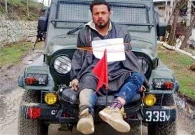 ماه گذشته نظامیان هندی که بر اثر ظلم فراوان در کشمیر با پرتاب سنگ از سوی مرد زجر کشیده این منطقه مواجه شده بودند، در یک اقدام غیرانسانی جوانی کشمیری را جلوی خودرو نظامی خود بستند و او را تبدیل به سپر انسانی کردند.