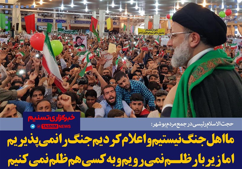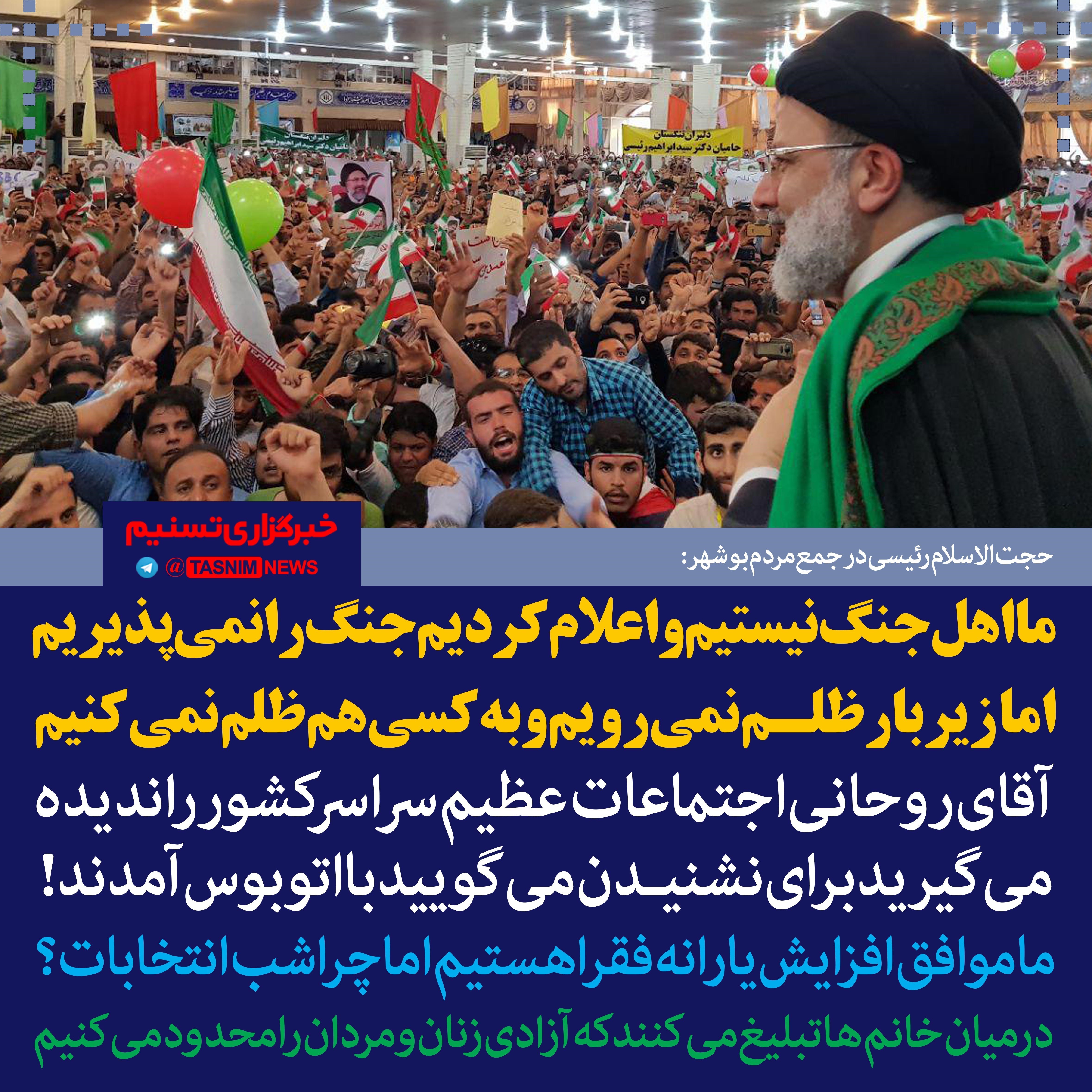 حجت الاسلام رئیسی در جمع پرشور مردم بوشهرگفت:آقای روحانی اجتماعات عظیم سراسر کشور را ندیده می گیرید. برای نشنیدن می گویید با اتوبوس آمدند! بعضی ها نخواستند حرف مردم را بشنوند و وقتی می شنوند که دیر شده است.