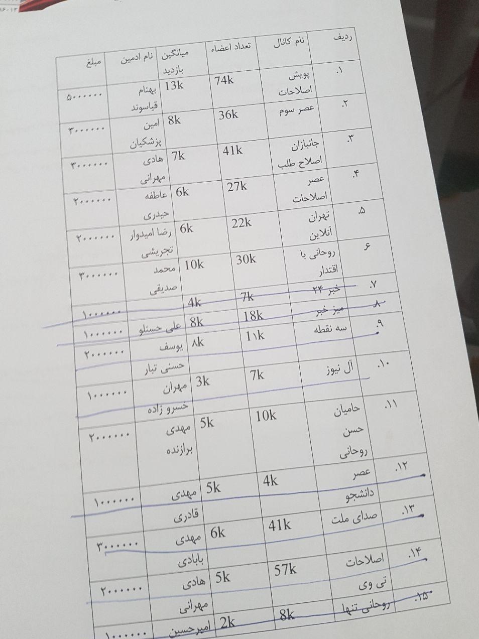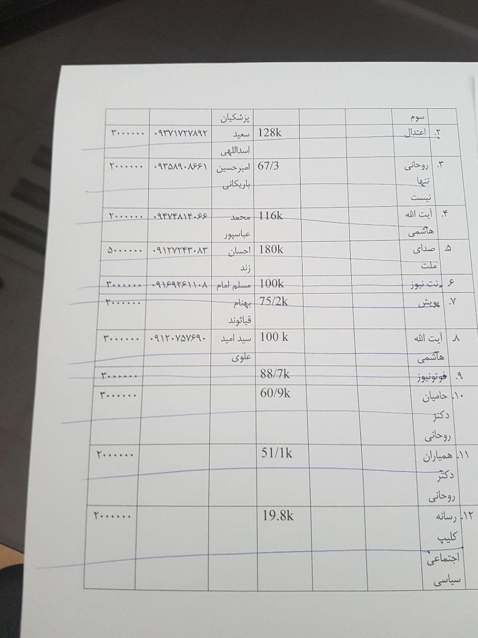 در ذیل لیست کانال‌های به همراه گردانندگان و وجوه واریزی به حساب آنها از سوی علی جنتی مسئول کمیته تبلیغات ستاد روحانی از منظرتان می‌گذرد.