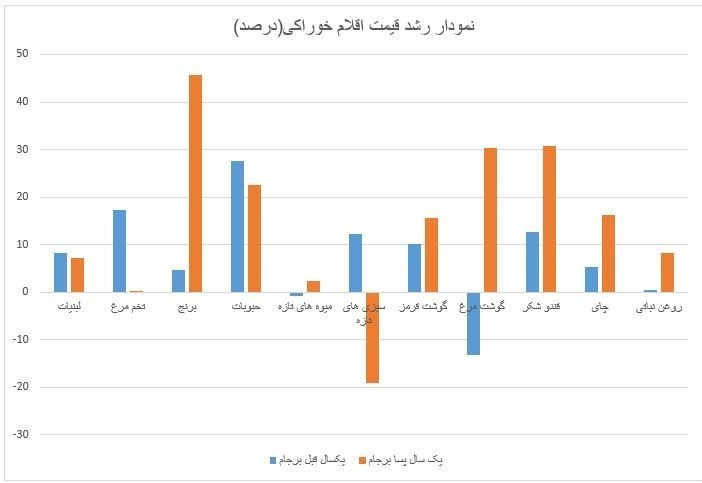 نمودار زیر نمونه ای از رشد قابل توجه قیمت کالاهای اساسی در دو سال اخیر است که نشان می دهد، نرخ تورم اعلامی بانک مرکزی گویای واقیعت های معیشت مردم نیست و به درستی حسن روحانی رئیس جمهور در اولین نشست خبری خود، معیار اصلی تورم را جیب مردم اعلام کرد.