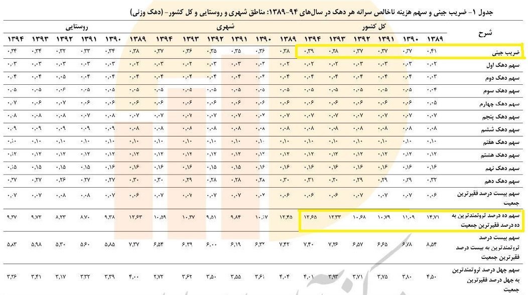 بر اساس گزارش هایی که مرکز آمار ایران منتشر کرده، ضریب جینی در سالهای اخیر فزاینده بوده است.