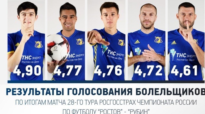 در این میان سایت باشگاه روستوف طبق روال تمامی دیدارهای رسمی اقدام به برگزاری نظرسنجی انتخاب بهترین بازیکن کرد که هواداران بیشترین آرای خود را به سردار آزمون اختصاص دادند. این ملیپوش ایرانی با کسب امتیاز 4.90 در جایگاه نخست قرار گرفت. نوبوآ، پولوز، کالاچف و گاتسکان در ردههای دوم تا پنجم برترینهای روستوف در بازی هفته بیستوهشتم لیگ برتر روسیه برابر روبینکازان قرار گرفتند.