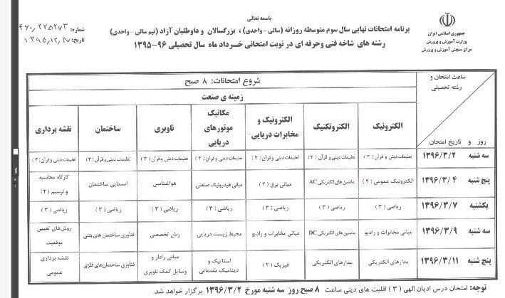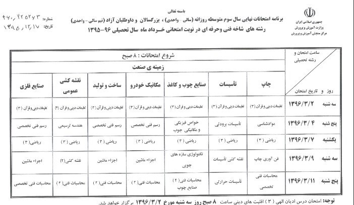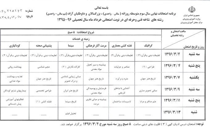 امتحانات نهایی دانش‌آموزان سال سوم متوسطه و دوره پیش دانشگاهی از روز سه‌شنبه دوم خرداد 96 آغاز و تا 25 خرداد ادامه دارد.