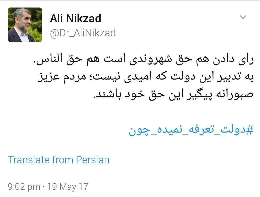 به گزارش خبرنگار سیاسی خبرگزاری تسنیم، علی نیکزاد مسئول ستاد انتخاباتی حجت‌الاسلام سید ابراهیم رئیسی کاندیدای دوازدهمین دوره انتخابات ریاست جمهوری در صفحه توئیتر خود نسبت برخی تخلفات صورت گرفته در جریان اخذ رای واکنش نشان داد.