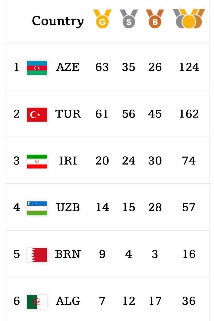 به گزارش خبرنگار اعزامی خبرگزاری تسنیم از باکو، مسابقات روز یازدهم و پایانی بازیهای کشورهای اسلامی امروز در کشور آذربایجان برگزار شد و پرونده کاروان ایران در چهارمین دوره این بازیها با کسب 39 مدال طلا، 26 نقره و 33 برنز و در مجموع کسب 98 مدال و ایستادن در رده سوم پس از آذربایجان و ترکیه بسته شد.