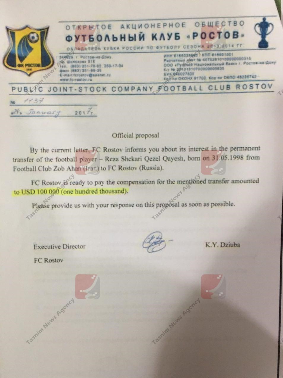 2-باشگاه روستوف پیشنهاد داد و حاضر به پرداخت صد هزار دلار شد، اما باشگاه ذوبآهن این رقم را نپذیرفت.