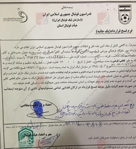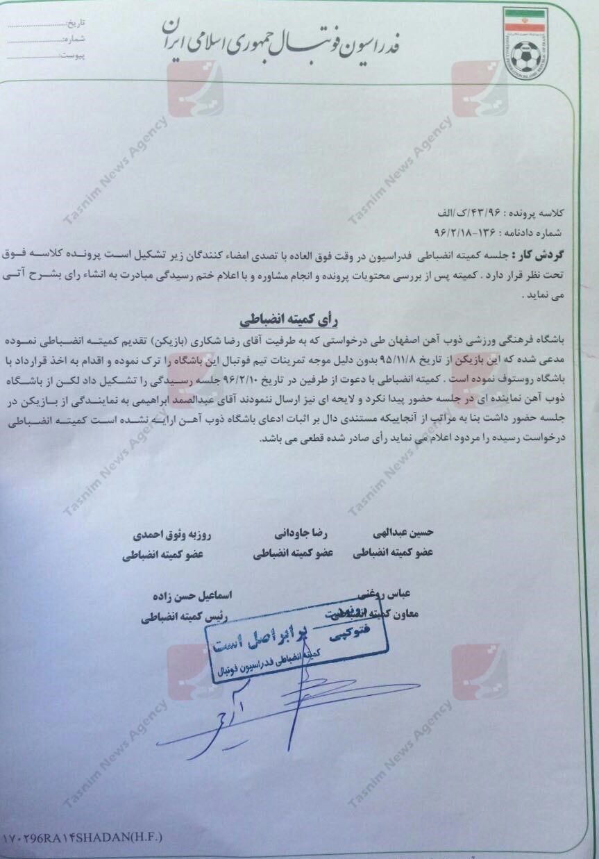 3-شکاری با حضور در هیئت فوتبال استان اصفهان در تاریخ 11 بهمن 1395 فسخ یکطرفه را ثبت و هزینه خروج از استان را هم پرداخت کرد. هیئت فوتبال ذیل برگ فسخ قرارداد نوشت که تأیید نهایی بهعهده مرجع حل اختلاف یا همان کمیته انضباطی فدراسیون است.