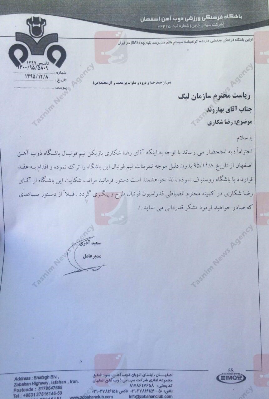 4-باشگاه ذوبآهن در همان فصل قبل و در اسفندماه 95 بابت پیوستن شکاری به روستوف به کمیته انضباطی شکایت کرد.