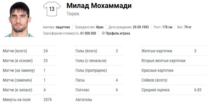 میلاد محمدی، موفقترین لژیونر ایرانی لیگ برتر روسیه در ارزیابی فنی و آماری خبرگزاری ورزشی چمپیونات این کشور است. او در 24 بازی برای تیم ترک گروژنی به میدان رفت.در 23 بازی به عنوان بازیکن اصلی به میدان رفت و یک بار هم تعویض شد. محمدی در یک بازی نیز به عنوان بازیکن تعویضی در ترکیب تیم ترک گروژنی قرار گرفت. معدل زمانی حضورش در میدان 2076 دقیقه است. 2 گل به ثمر رساند و 4 پاس گل داد. 3 کارت زرد نیز در طول فصل دریافت کرد. نمره فنی او 6.83 (خوب) است. این آمار میلاد محمدی را بالاتر از سردار آزمون و سعید عزتاللهی قرار داده و او به موفقترین لژیونر ایرانی لیگ برتر روسیه تبدیل کرده است.