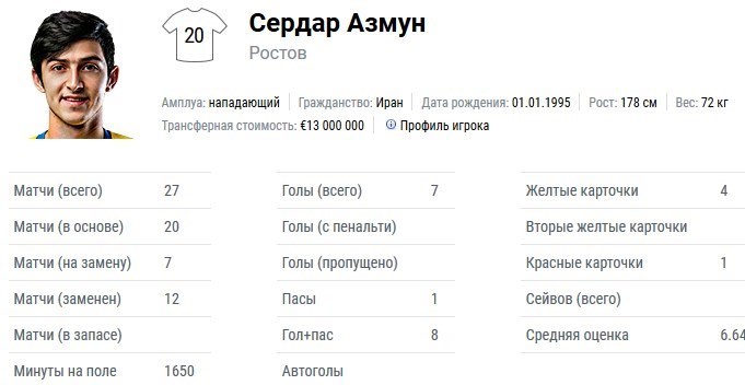سردار آزمون پس از میلاد محمدی دومین لژیونر موفق ایرانی لیگ برتر روسیه از نظر فنی و آماری است. سردار در 27 بازی برای تیم روستوف به میدان رفت که حاصل آن 7 گل و یک پاس گل بود. تعداد گلهای سردار آزمون به نسبت فصل قبل لیگ برتر روسیه کاهش محسوسی یافت. این ملیپوش ایرانی در ترکیب اصلی 20 بازی روستوف حضور داشت. در 12 بازی تعویض شد و 7 بار نیز به عنوان بازیکن تعویضی در ترکیب روستوف قرار گرفت. 1650 دقیقه معدل زمانی حضور سردار آزمون در زمین است. 4 کارت زرد و یک کارت قرمز دریافت کرد. خبرگزاری ورزشی چمپیونات روسیه با مشارکت کاربران و کارشناسان خود برای سردار آزمون نمره فنی خوب 6.64 را در نظر گرفت.