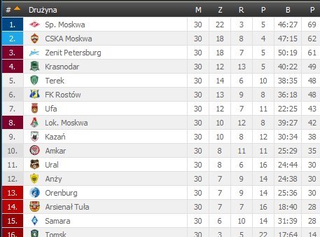 جدول ردهبندی نهایی لیگ برتر روسیه