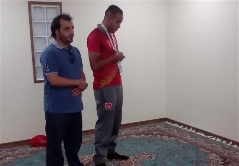 * یکی از بازیکنان لخویا که در لیست نبود و در جایگاه ویژه حضور داشت بین دو نیمه نماز را به جا آورد.
