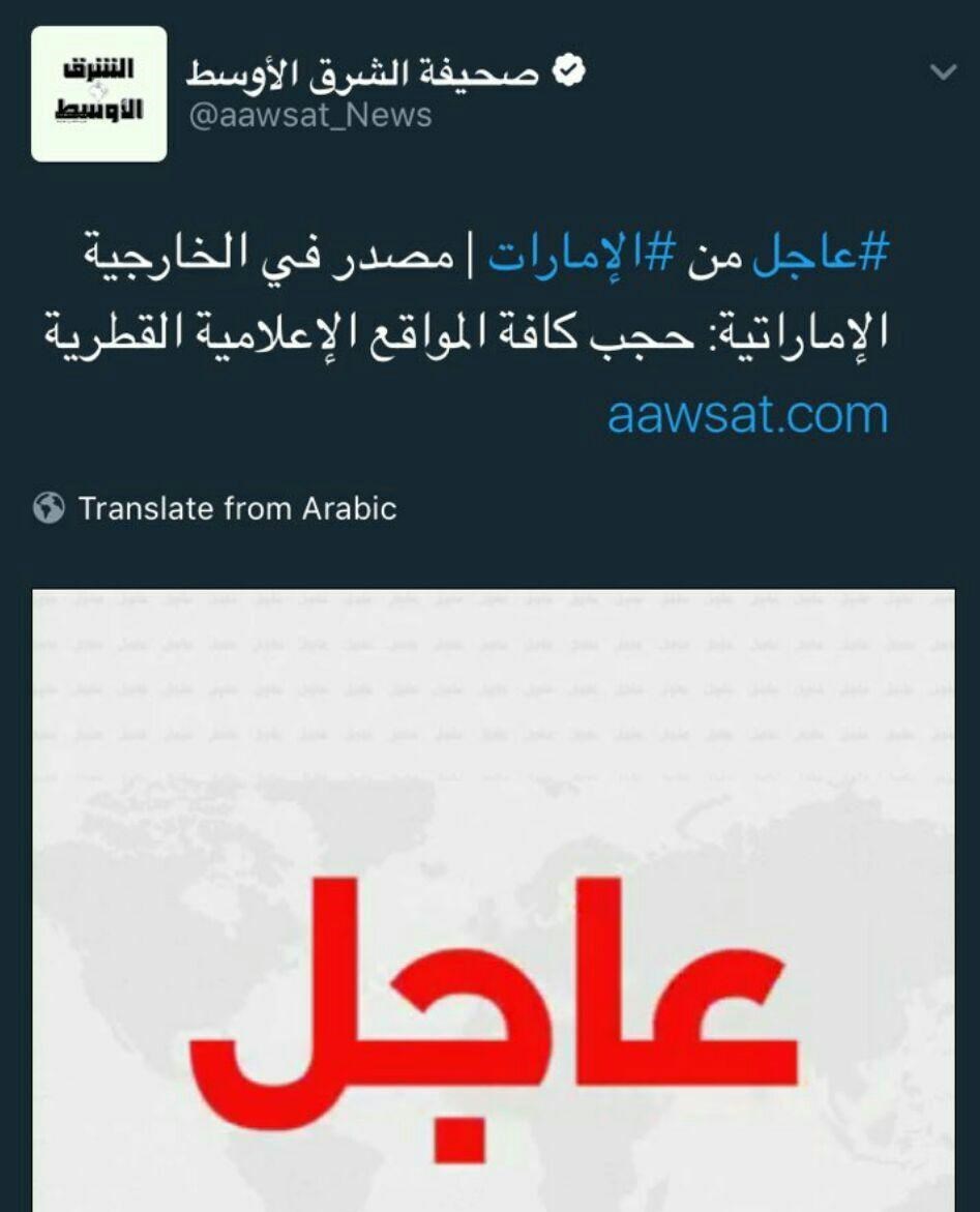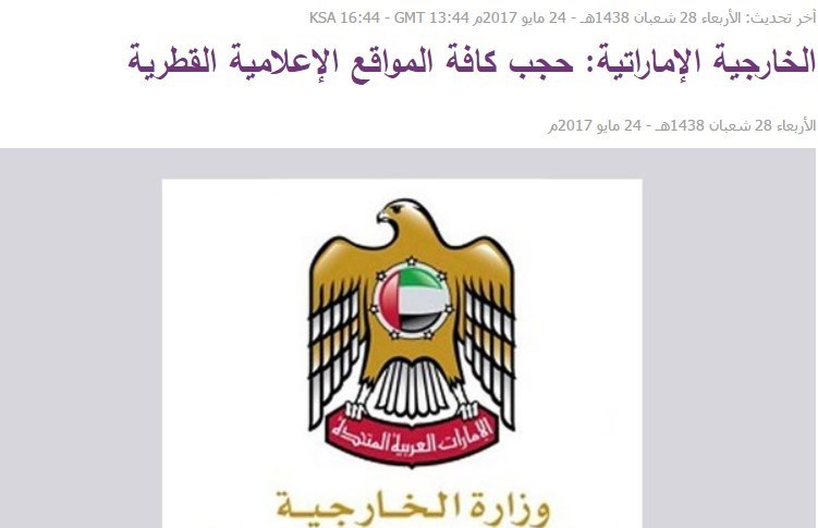 به گزارش گروه رسانه های خبرگزاری تسنیم، بر اساس گزارشات یک منبع آگاه در وزارت امور خارجه امارات تمامی سایتهای رسانه ای کشور قطر فیلتر شدند که این اتفاق در روز چهارشنبه 24 مه 2017 معادل  سوم خرداد 96 شمسی رخ داده است، البته قبل از این اقدام توسط امارات ، از طرف پادشاهی عربستان هم سایتهای قنا، الجزیره، الرایه، الوطن، الشرق، العرب و سایر خبرگزاری ها مانند الجزیره انگلیسی و مستند هم مسدود شده بود.