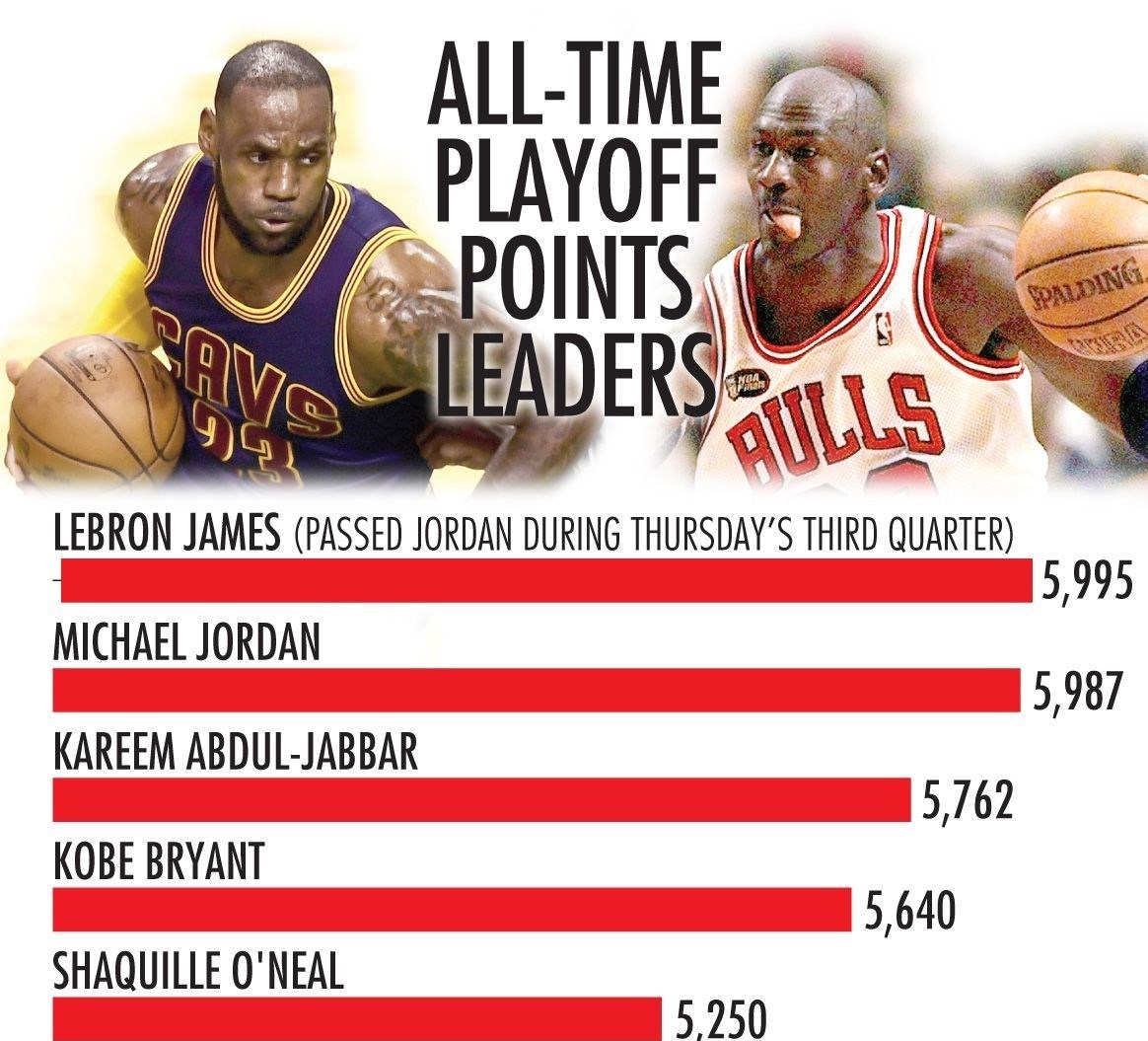 جیمز روز گذشته در بازی پنجم کنفرانس شرق لیگ با یک شوت 3 امتیازی که در دقیقه دهم کوارتر سوم، وارد سبد بوستون سلتیکس کرد از رکورد مایکل جردن، اسطوره بسکتبال آمریکا و تیم شیکاگو بولز گذشت. جیمز در ابتدای بازی 28 امتیاز برای شکستن رکورد جردن فاصله داشت ولی او بازی را 35 امتیاز تمام کرد و تعداد امتیازات خود در مرحله پلیآف را به 5996 در مقابل 5987 امتیاز مایکل جردن رساند.
