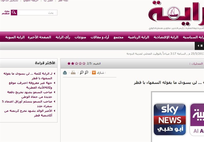 این روزنامه ادامه داد: عجیب و تاسف آور اینکه شبکه های رسانه ای از جمله العربیه اسکای نیوز حتی پس از تکیب این اخبار از سوی مدیر دفتر ارتباطات دولتی و مدیریت خبرگزاری قطر مبنی بر هک شدن خبرگزاری قطر (قنا) همچنان به پخش اخبار ساختگی ادامه دادند.