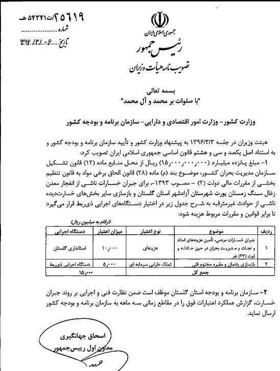 با توجه به وعده ها و مصاحبه های صورت گرفته، بسیاری منتظر بودند تا ببینند در عمل، دولت چه کمکی به خانواده های داغدار و سایر آسیب دیدگان این حادثه خواهد کرد و حال، پس از برگزاری انتخابات مصوبه ای جالب از سوی دولت، آب پاکی را بر روی تمام تصورات روزها و هفته های قبل ریخته است. هیئت دولت در جلسه سوم خرداد ماه خود، به پیشنهاد وزارت کشور مصوبه ای را به تصویب رسانده که بر اساس آن مبلغ 1.5 میلیارد تومان از محل منابع ماده (12) قانون تشکیل سازمان مدیریت بحران کشور، برای جبران خسارات ناشی از انفجار معدن ذغال سنگ زمستان یورت شهرستان آزاد شهر در استان گلستان و البته بازسازی سایر بخش های خسارت دیده ناشی از حوادث غیر مترقبه در اختیار دستگاههای اجرایی قرار میگیرد.