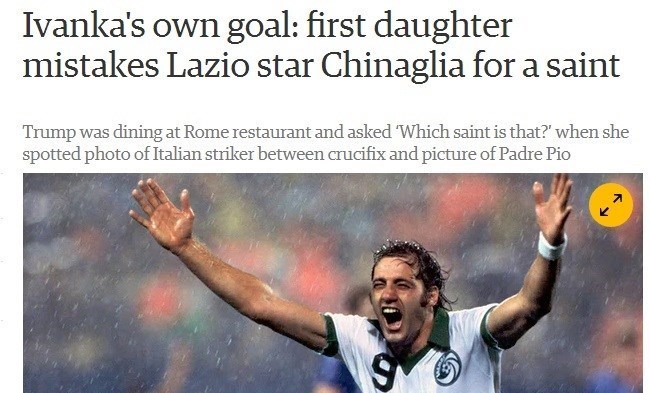 به گزارش گروه رسانههای خبرگزاری تسنیم، صاحب رستورانی در شهر رم فاش کرد زمانی که ایوانکا ترامپ بههمراه همسرش جرد کوشنر به رستوران وی آمده و سفارش ناهار میدهند پس از آن ایوانکا دستهایش را بهسوی عکس اسطوره لاتزیو و تاریخ فوتبال جهان و بازیکن سابق نیویورک کاسموس آمریکا نشانه رفت و با حالت عجیبی گفت: این قدیس ایتالیایی کیست؟
