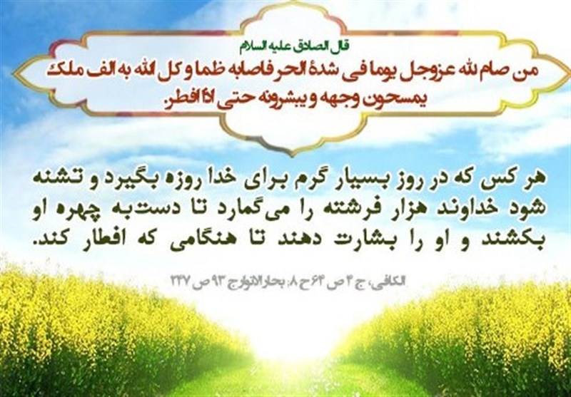 «مَنْ صَامَ لِلَّهِ عَزَّوَجَلَّ یَوْماً فِی شِدَّةِ الْحَرِّ فَأصَابَهُ ظَمَأٌ وَکَّلَ اللَّهُ بِهِ ألْفَ مَلَکٍ یَمْسَحُونَ وَجْهَهُ وَ یُبَشِّرُونَهُ حَتَّى إِذَا أفْطَرَ قَالَ اللَّهُ عَزَّوَجَلَّ لَهُ مَا أطْیَبَ رِیحَکَ وَ رَوْحَکَ مَلَائِکَتِی اشْهَدُوا أنِّی قَدْ غَفَرْتُ لَه»؛