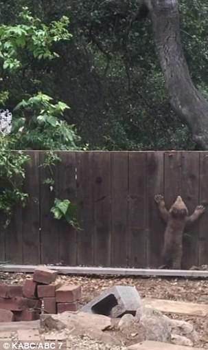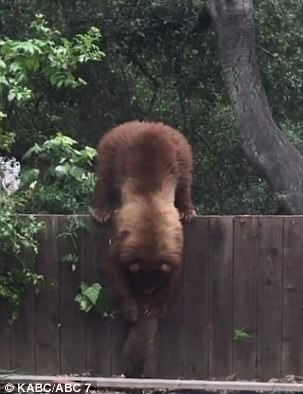 خرس مادر که از حصار حیاط رد شده بود تلاش میکرد توله خرس را که برای بالا رفتن از پرچین تقلا میکرد کمک کند.