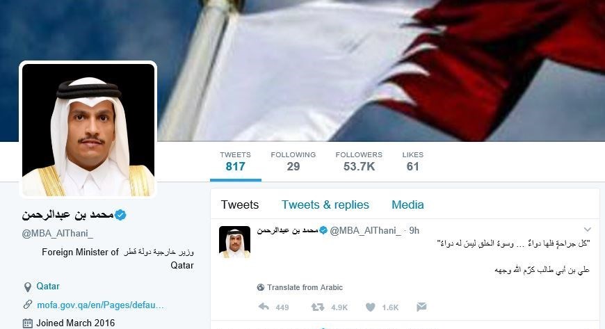 به گزارش گروه سیاست خارجی خبرگزاری تسنیم، "محمد بن عبدالرحمن آل ثانی" وزیر امور خارجه قطر در توییت جدید خود به حدیثی از حضرت علی(ع) اشاره کرده که فرموده‌اند: هر زخمی دوایی دارد، جز اخلاق بد که درمانی ندارد.
