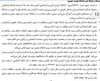 در دفترچه آزمون استخدامی دستگاههای اجرایی سال 95 در رابطه با جذب نیرو در آموزشوپرورش آمده است: در صورت موفقیت در دوره یکساله مهارتآموزی، احکام کارگزینی با رعایت سایر ضوابط و مقررات از جمله تایید گزینش از تاریخ اول مهر 96 صادر خواهد شد.