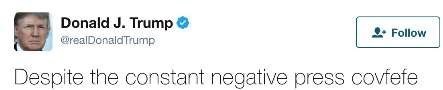 روزنامه 'یو اس ای تودی' طی گزارشی در این زمینه نوشت: ترامپ که از زمان بازگشت از اولین سفر خارجی اش به عنوان رئیس جمهور در صفحه توئیترش فعال بوده است، بامداد چهارشنبه توئیتی را با مضمون «با وجود مطبوعات منفی (واژه ناشناخته ) Covfefe» منتشر کرد.