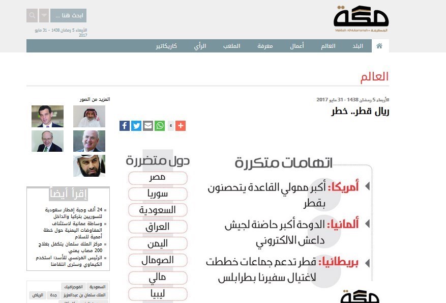 روزنامه «مکه» از دیگر روزنامه های سعودی نیز مقالهای را به متهم کردن قطر به حمایت مالی از فعالیت های تروریستی افراطی در منطقه خاورمیانه و دو قاره آفریقا و آسیا اختصاص داد و نوشت: در طول 22 سال گذشته ریال قطری سرفصل حمایت از فعالیت های القاعده بوده است.