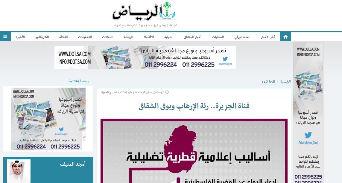 روزنامه «الریاض» نیز در مطلبی با عنون «تلویزیون الجزیره، ریه تروریسم و بلندگوی تفرقه» این شبکه را هدف انتقاد قرار داد و نوشت: سیاست های الجزیره که مخالف اجماع عربی است موجب شد این شبکه به میزان زیادی در بسیاری از کشورهای عربی طرد و منزوی شود تا جایی که برخی از دولت ها کارکنان این شبکه را اخراج و دفاتر آن را تعطیل کردند که نمونه آن را در مصر، بحرین، الجزایر، کویت، گامبیا و انگلیس و پاکستان و عراق شاهد بودیم که همگی ناشی از تحریک افکار عمومی و انتشار اخبار کذب و دخالت در مسائل داخلی بود.