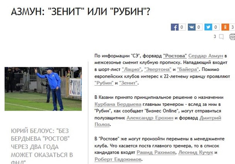 در ادامه این خبر آمده است: علاوه بر باشگاهای اروپایی 2 تیم روسی زنیت سن پترزبورگ و روبینکازان نیز علاقمند به جذب سردار آزمون هستند.