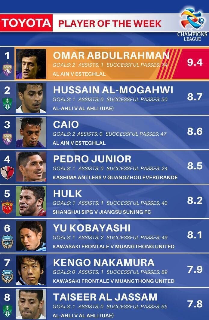 در همین حال سایت AFC عمر عبدالرحمن را به‌خاطر عملکرد خوبش در بازی برابر استقلال به‌عنوان بهترین بازیکن دور برگشت از مرحله یک‌هشتم نهایی لیگ قهرمانان آسیا معرفی کرده است. او با کسب نمره 9.4 بالاتر از حسین المقهوی (نمره 8.7) و کایو (نمره 8.6) هر دو از الاهلی عربستان قرار گرفته است.