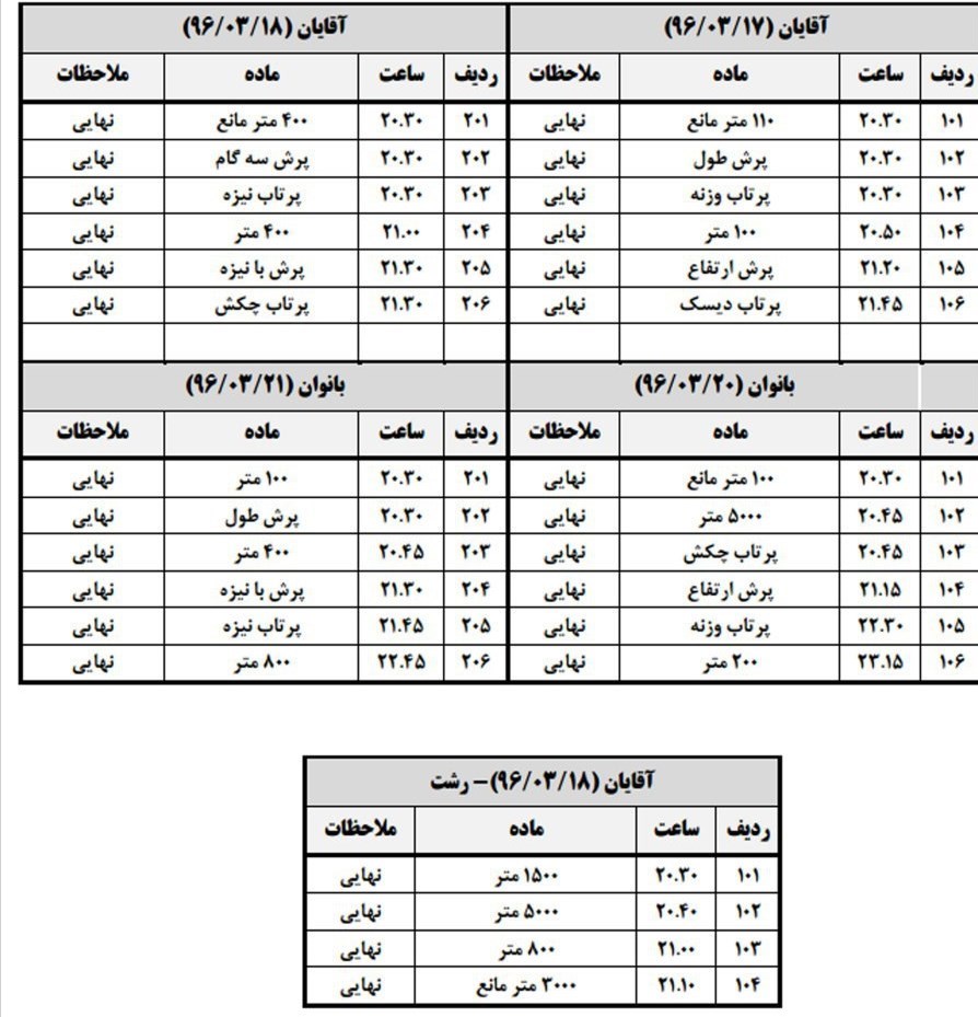 مسابقات بخش مردان در روزهای 17 و 18 خرداد زمان‌بندی شده که البته 4 ماده دوی 800 متر، 1500 متر، 3 هزار متر با مانع و 5 هزار متر در رشت برگزار خواهد شد. مسابقات بخش بانوان نیز 20 و 21 خرداد در ورزشگاه آفتاب انقلاب برگزار می‌شود.