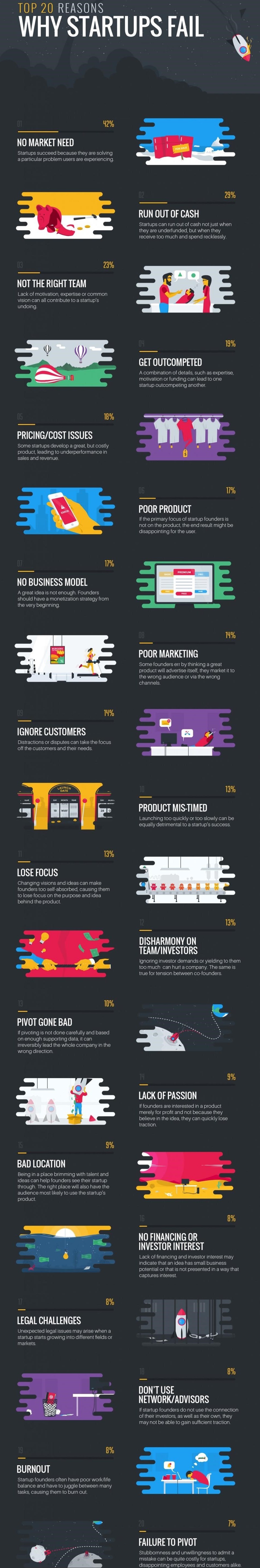مرکز تحقیقاتی بینالمللی با نام سی.بی.اینسایت اخیراً طی مصاحبهای که با مؤسسان 156 استارتاپ داشته، به دلایل اصلی شکست آنها پرداخته و 20 دلیل اصلی را استخراج کرده است.
