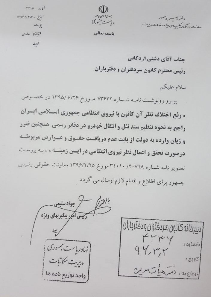 به گزارش خبرنگار قضایی خبرگزاری تسنیم، جواد سلیمی - رئیس امور پیگیریهای ویژه دفتر رئیس جمهور در پاسخ به نامه محمدرضا دشتی اردکانی رئیس کانون سردفتران و دفتریاران درباره لزوم یا عدم لزوم ثبت معاملات نقل و انتقال خودرو در دفاتر اسناد رسمی اعلام کرده است:پیرو رونوشت نامه شماره 73632 مورخ 24 شهریور 1395 در در خصوص رفع اختلاف نظر آن کانون با نیروی انتظامی راجع به نحوه تنظیم سند نقل و انتقال خودرو در دفاتر رسمی و ضرر و زیان وارده به دولت از بابت عدم دریافت حقوق و عوارض مربوطه در صورت تحقق و اعمال نظر نیروی انتظامی در این زمینه، به پیوست تصویر نامه شماره 31010/20718 مورخ 25 اردیبهشت 96 معاونت حقوقی رئیس جمهور برای اطلاع و اقدام لازم ارسال میشود.