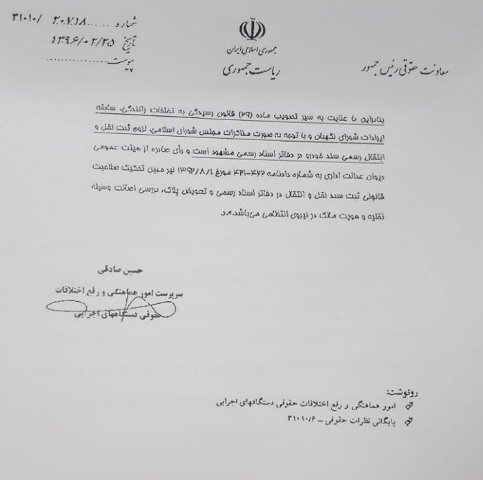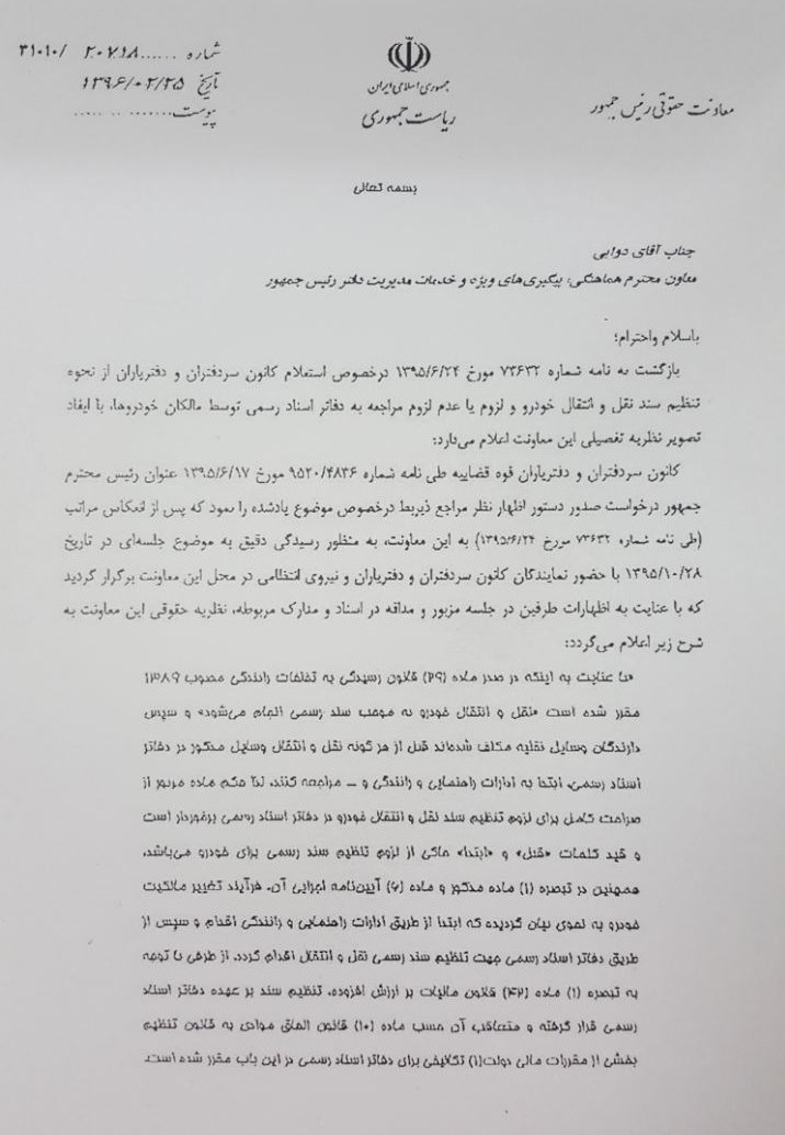 در نامه معاونت حقوقی رئیس جمهور نیز آمده است: با عنایت به اینکه در صدر ماده 29 قانون رسیدگی به تخلفات رانندگی مصوب سال 1389 مقرر شده است« نقل و انتقال خودرو به موجب سند رسمی انجام میشود» و سپس دارندگان وسایل نقلیه مکلف شدهاند قبل از هرگونه نقل و انتقال وسایل مذکور در دفاتر اسناد رسمی، ابتدا به ادارات راهنمایی و رانندگی مراجعه کنند؛ لذا حکم ماده مزبور از صراحت کامل برای لزوم تنظیم سند نقل و انتقال خودرو در دفاتر اسناد رسمی برخوردار است.