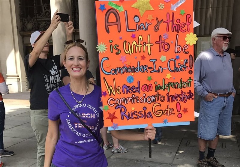 معترضان آمریکایی در واشنگتن، در فاصله کمی از کاخ سفید تجمع کردند و خواستار تشکیل یک کمیسیون مستقل برای تحقیق درباره تبانی احتمالی بین ستاد انتخاباتی «دونالد ترامپ» رئیس جمهور آمریکا با روسیه شدند.