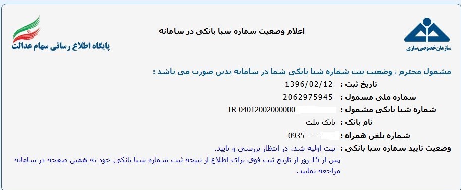 به گزارش خبرگزاری تسنیم، سازمان خصوصی سازی پیشتر در خصوص اعلام شماره شبا برای دریافت سود سهام عدالت اعلام کرده بود: "دوره بررسی و تطبیق منجر به تایید یا عدم تایید شماره شبا در حدود 15 روز است. سازمان خصوصی سازی از طریق سیستم بانکی طی این مدت شبا بانکی مشمولان را بررسی می نماید و در صورت تایید، پیام تایید نهایی شبا از طریق سامانه قابل مشاهده است. تنها پیامکی که از سوی سامانه سهام عدالت و سازمان خصوصی سازی برای افراد ارسال می شود این است که شماره شبا وارد شده با نام مشمول مطابقت ندارد یا شبا ثبت شده متعلق به یک حساب بانکی مسدود است، به همین دلیل به پیامک های دیگر که تحت عنوان سهام عدالت از شماره های ناشناس ارسال می شود، نباید توجه شود."