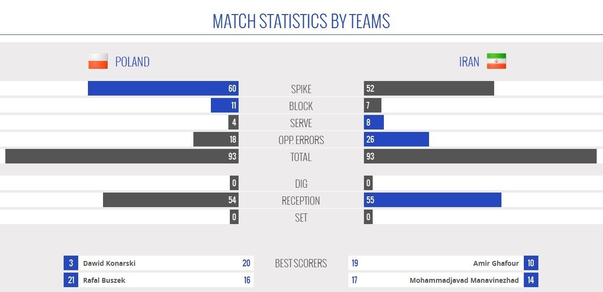 امتیازآورترین بازیکن این دیدار «داوید کونارسکی» بود که 20 امتیاز برای لهستان کسب کرد. امیر غفور هم مثل بازی قبلی مقابل برزیل با 19 امتیاز، موثرترین بازیکن ایران بود. جواد معنوینژاد هم 17 امتیاز دیگر برای ایران به دست آورد.