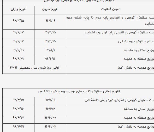 وی افزود: ثبت سفارش کتابهای درسی پایه دوم تا ششم ابتدایی از تاریخ 19 فرودین 96 آغاز شد و دانشآموزان تا 15 خرداد فرصت داشتند تا برای ثبت سفارش به سامانه اعلام شده مراجعه کنند.