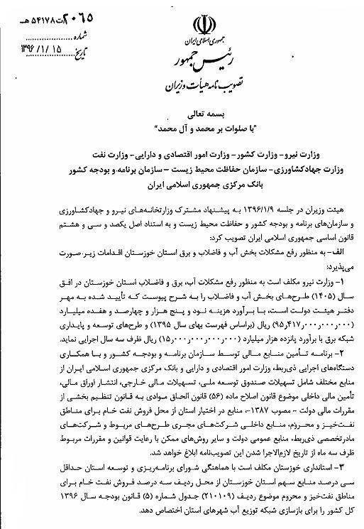 اما تصویب بودجه های مختلف برای مهار ریزگردها و البته عدم تخصیص آنها در زمان مقتضی تنها به این موارد بالا ختم نمی شود و هر از گاهی سندی جدید از وعده ها و مصوبات فاقد کارشناسی دولت سر از رسانه ها در می آورد. حال نوبت پیدا شدن مصوبه نهم فروردین ماه هیئت دولت است که با پیشنهاد مشترک وزات خانه های نیرو، جهاد کشاورزی، سازمان برنامه و بودجه کشور و حفاظت محیط زیست به تصویب رسیده است. دراین مصوبه که هدف اصلی آن رفع مشکلات بخش آب و فاضلاب و برق استان خوزستان است، نیم نگاهی نیز به مباحث زیست محیطی و ریزگردهایی که نفس مردم خوزستان را به شماره انداخته نیز شده است.