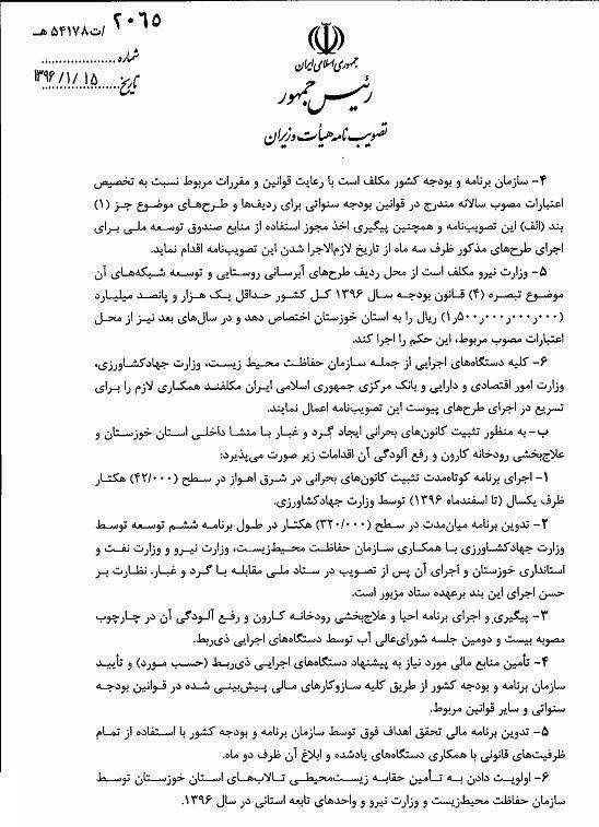 بر اساس این مصوبه که نسخه ای از آن نیز در اختیار مشرق است، دولتی ها به موضوع ریزگردها و رفع آلودگی های رودخانه کارون نیز ورود کرده اند و در بخشی از آن که به عنوان"برنامه کوتاه مدت تثبیت کانون های بحرانی ریزگرد در شرق اهواز" (بند ب صفحه دوم مصوبه) تدوین شده، وزارت جهاد کشاورزی مکلف به تثبیت 42هزار هکتار از این کانون ها حداکثر تا پایان اسفند ماه امسال شده است.