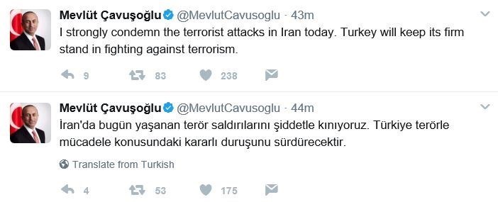به گزارش گروه سیاست خارجی خبرگزاری تسنیم، مولود چاووش اوغلو وزیر خارجه ترکیه در پیام توییتری خود ضمن محکوم کردن حادثه تروریستی تهران اعلام کرد: من قویاً حملات تروریستی امروز در ایران را محکوم میکنم. ترکیه موضع مستحکم خود در مبارزه علیه تروریسم را حفظ خواهد کرد.