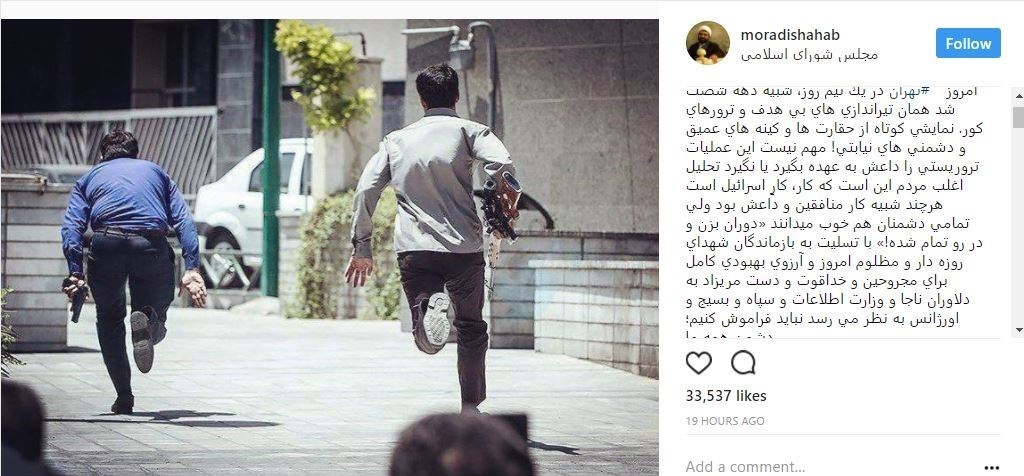 به گزارش گروه رسانه های خبرگزاری تسنیم، شهاب مرادی در صفحه شخصی خود نوشت: تهران در یک نیم روز، شبیه دهه شصت  شد همان تیراندازی های بی هدف و ترورهای کور. نمایشی کوتاه از حقارت ها و کینه های عمیق و دشمنی های نیابتی! مهم نیست این عملیات تروریستی را داعش به عهده بگیرد یا نگیرد تحلیل اغلب مردم این است که کار، کارِ اسرائیل است هرچند شبیه کار منافقین و داعش بود ولی تمامی دشمنان هم خوب میدانند «دوران بزن و در رو تمام شده!» با تسلیت به بازماندگان شهدای روزه دار و مظلوم امروز و آرزوی بهبودی کامل برای مجروحین و خداقوت و دست مریزاد به دلاوران ناجا و وزارت اطلاعات و سپاه و بسیج و اورژانس به نظر می رسد نباید فراموش کنیم؛ دشمن همه ما آمریکا و اسرائیل است! پس  متلک های سیاسی علیه یکدیگر بازی در زمین دشمن است.