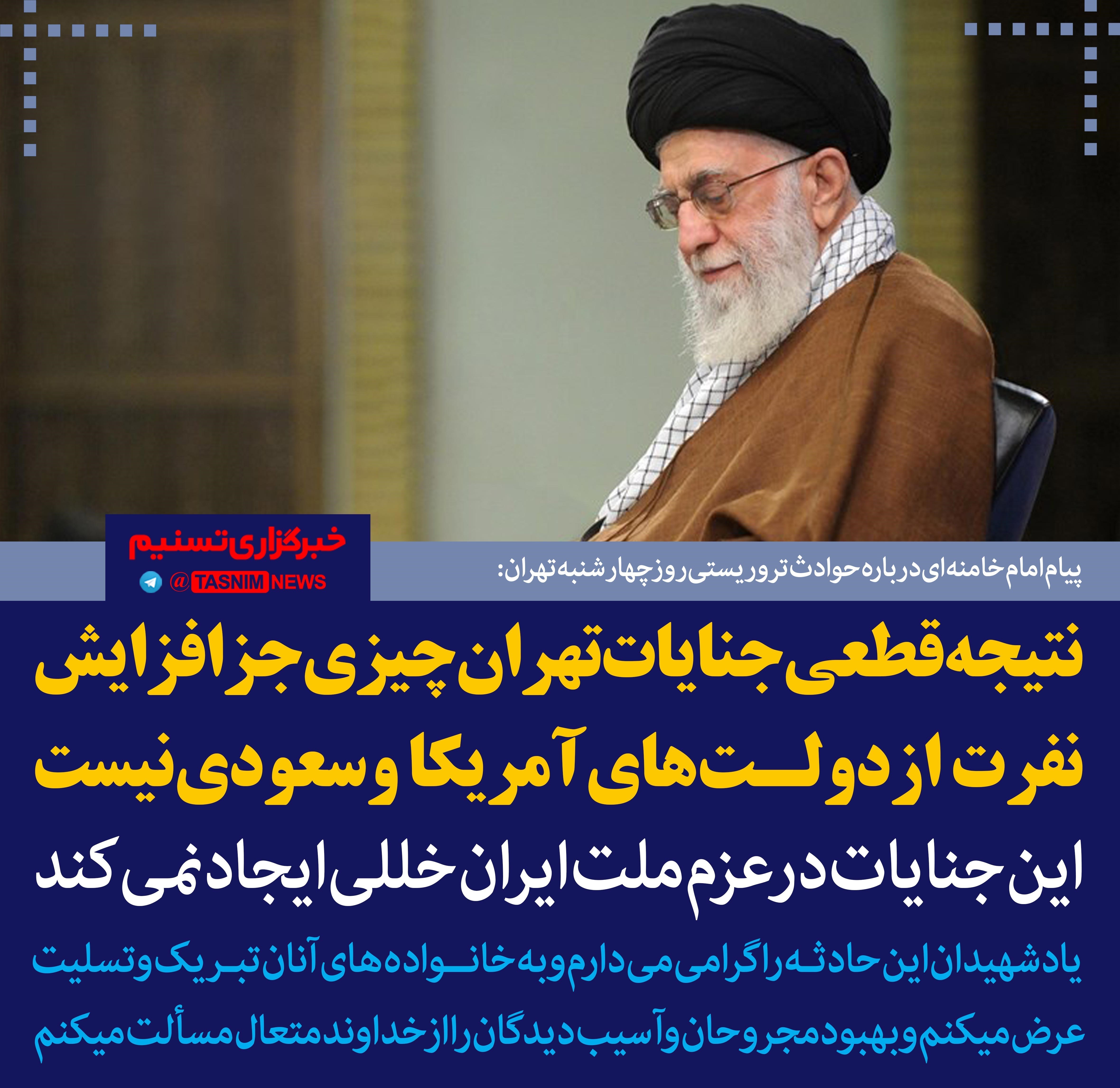 در پی حادثه‌ تروریستی تهران که به شهادت و زخمی شدن جمعی از مردم روزه‌دار انجامید، رهبر معظم انقلاب اسلامی پیام تسلیتی صادر کردند.