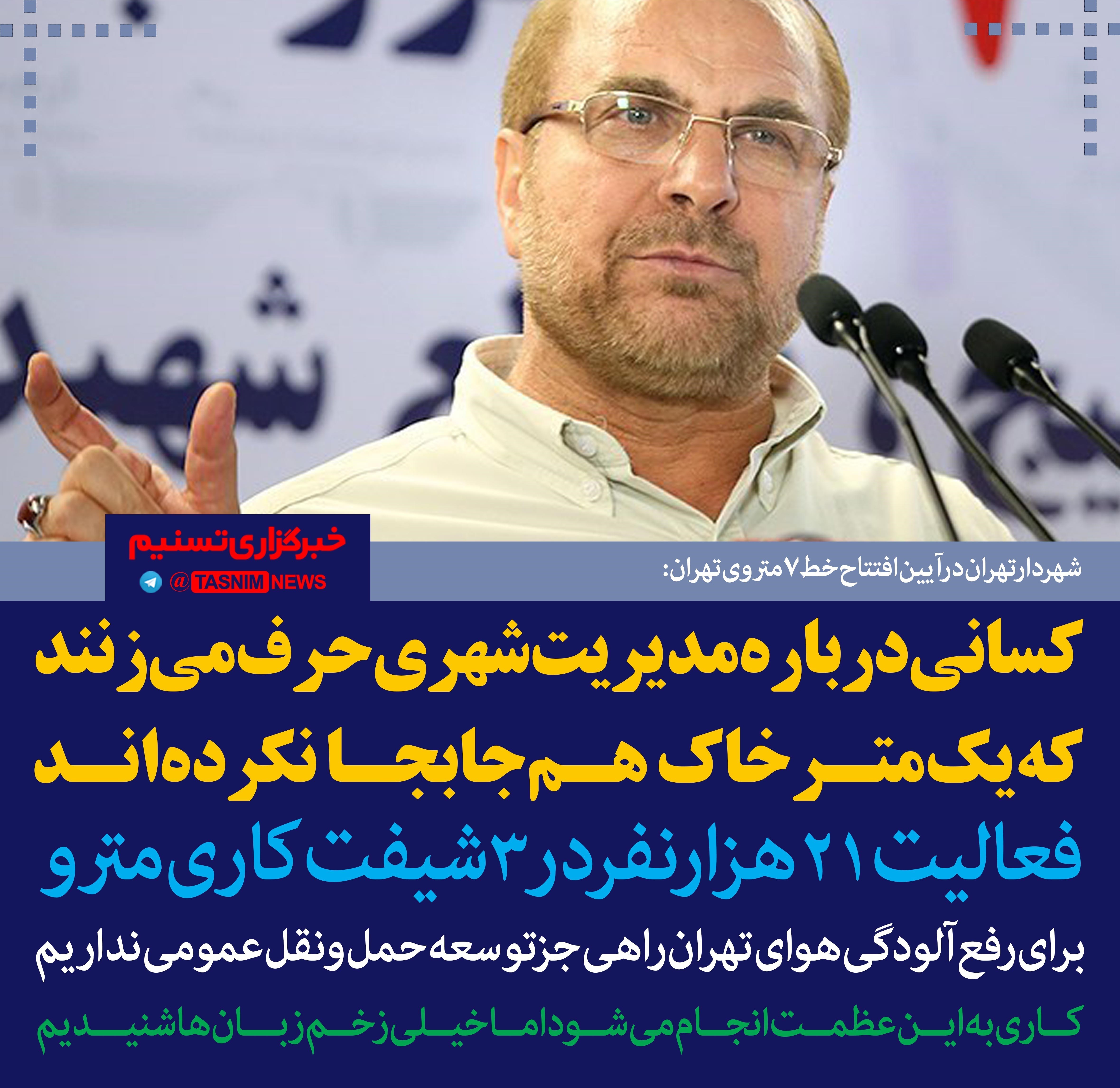 شهردار تهران ضمن ابراز گلایه از زخم زبان‌ها در برابر ساخت و بهره‌برداری از پروژه بزرگ خط 7 متروی تهران تاکید کرد:کاری به این عظمت انجام می‌شود اما خیلی زخم زبان‌ها شنیدیم، کسانی که یک متر خاک جابه‌جا نکرده‌اند حالا می‌خواهند در مورد شهر صحبت کنند.